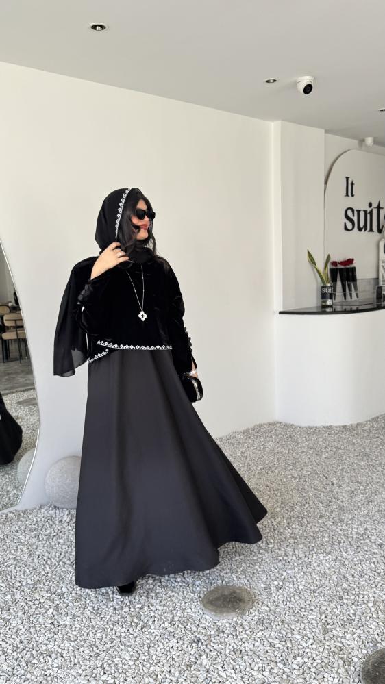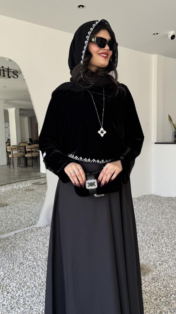 كلوش مخمل من الأعلى ، وتفته من الأسفل تطريز من الأمام والخلف باللون الفضي