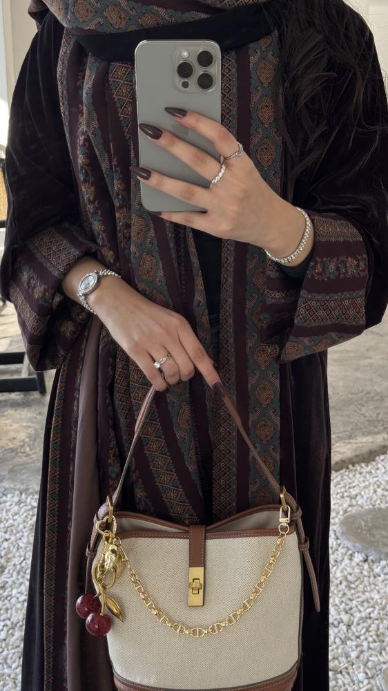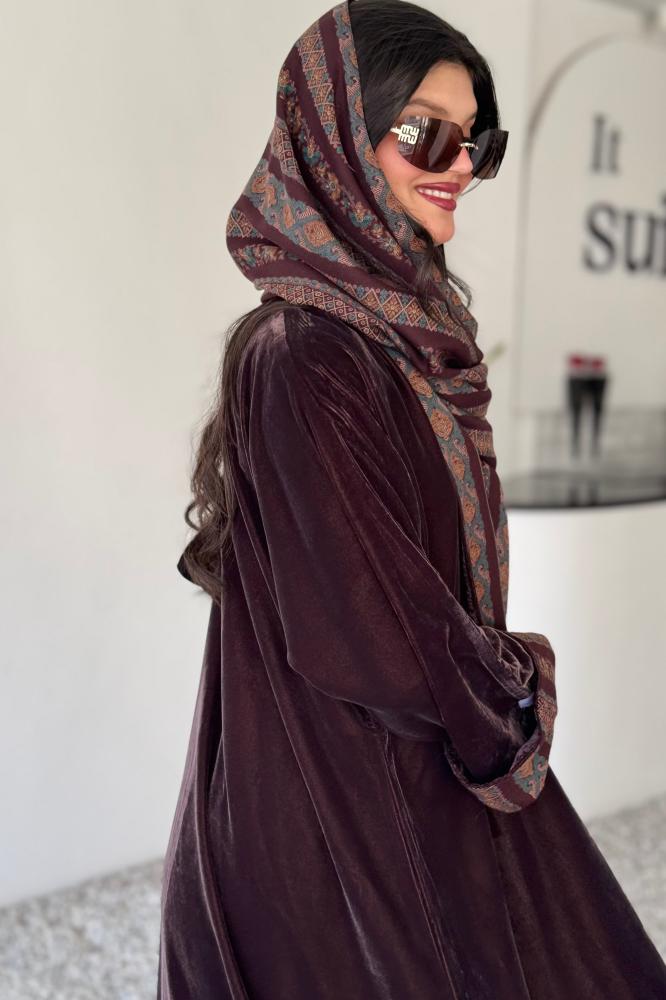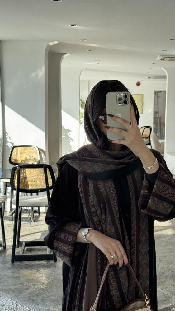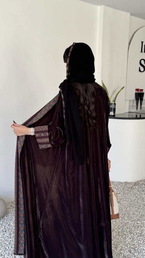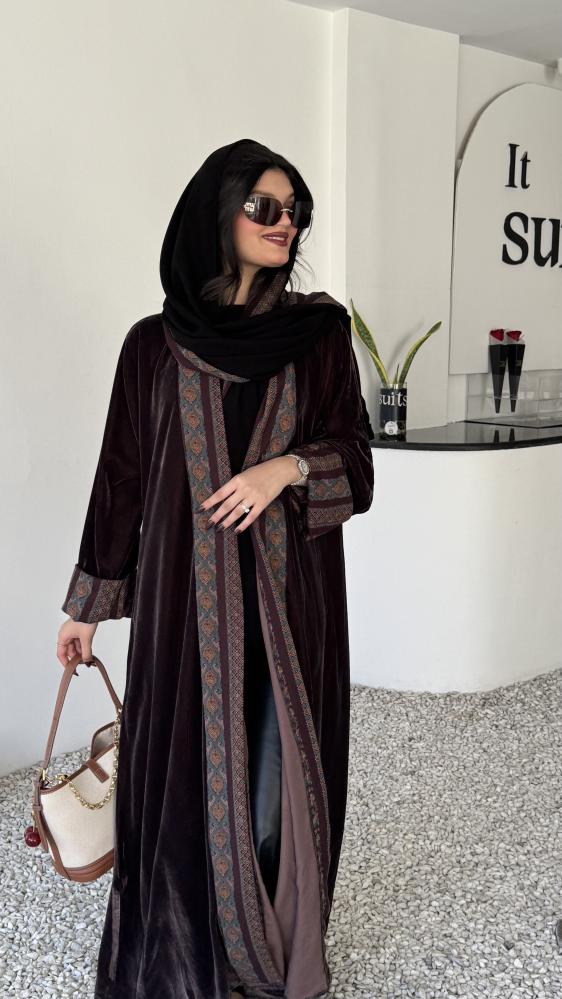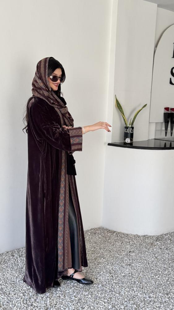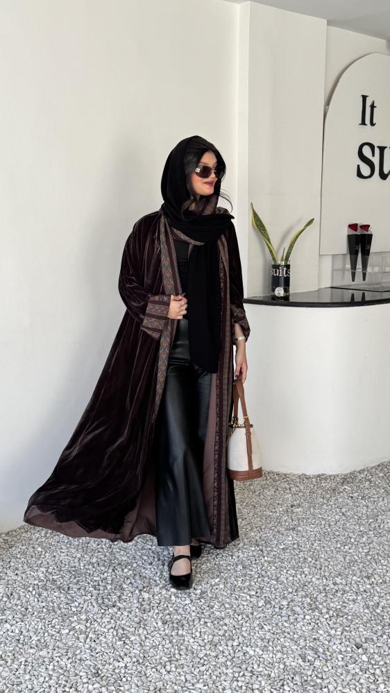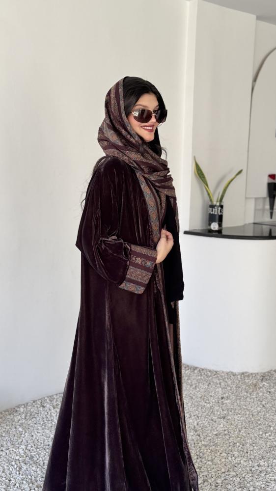 مخمل بني كلوش وكم كشميري وطرحه بوجهين(إمكانية تغيير لون المخمل أو الخامه)