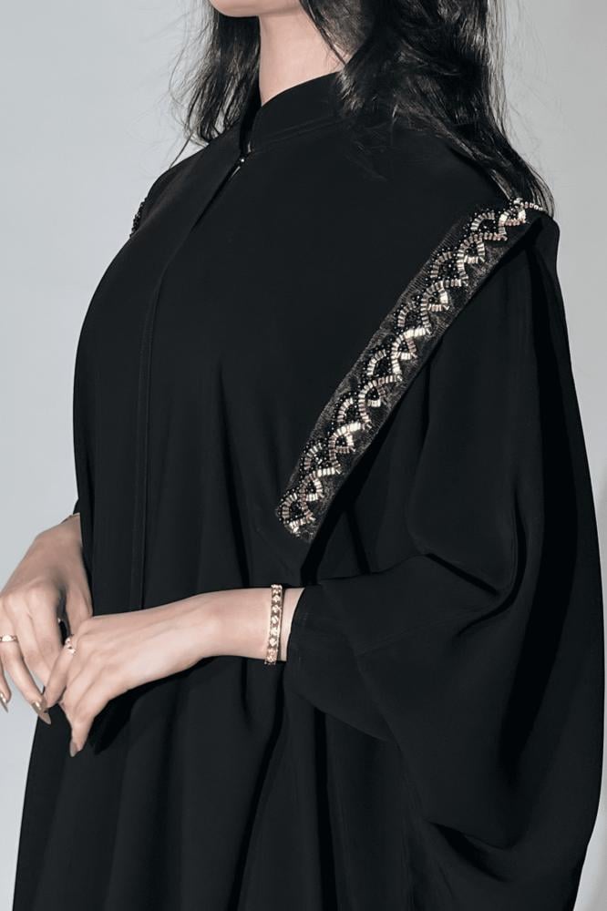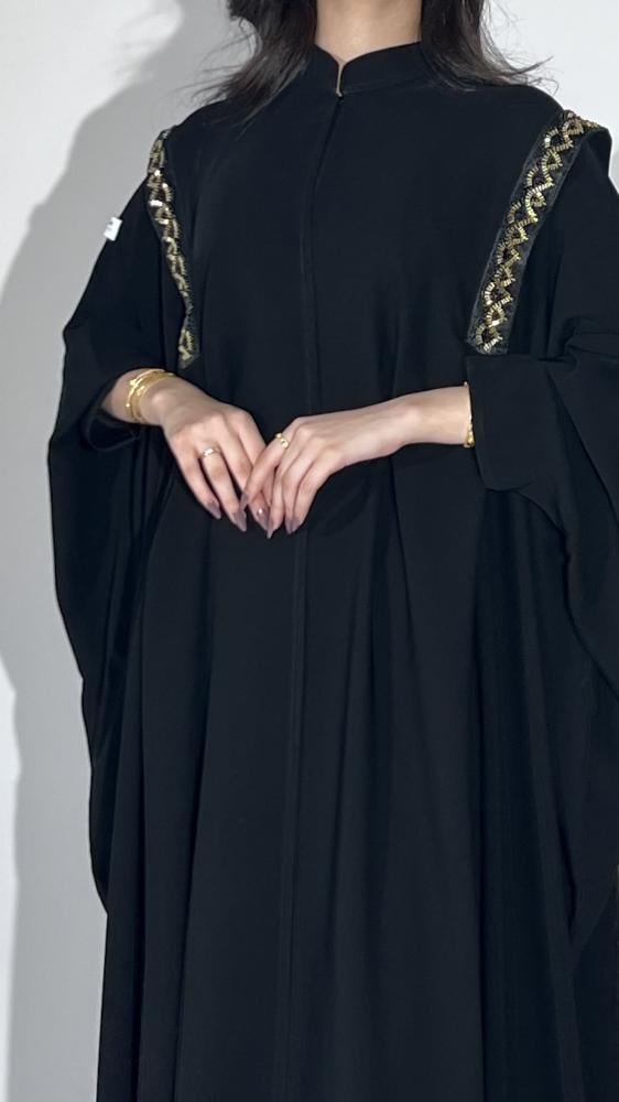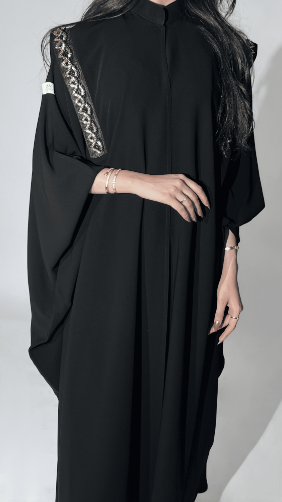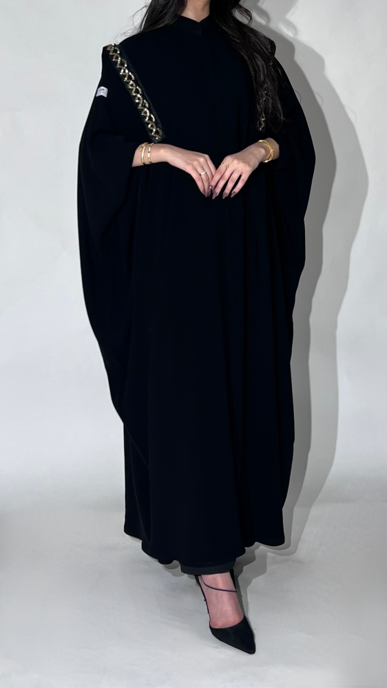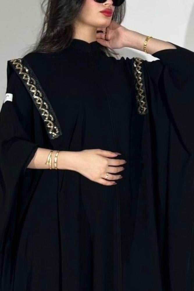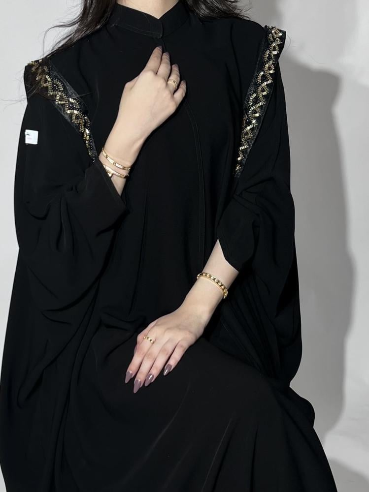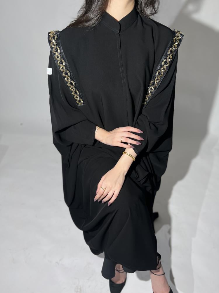- نوع المنتج: كريب ملكي بسواد فاحم بتطريز ذهبي على الاكتاف.
