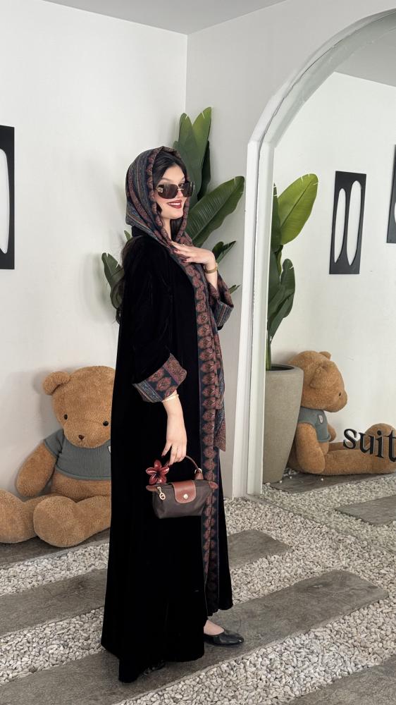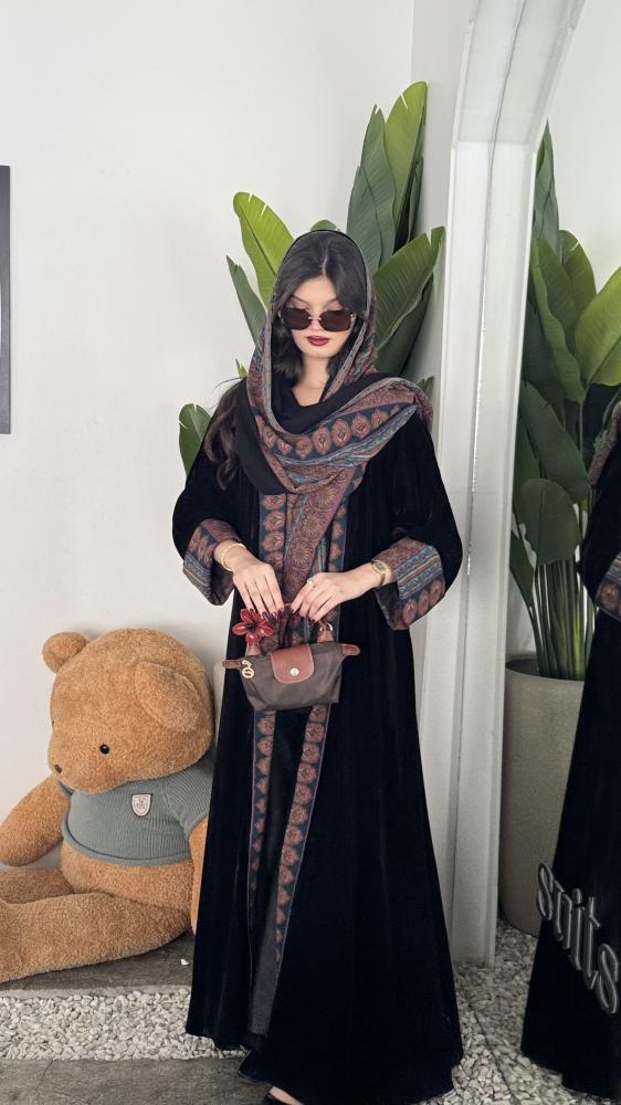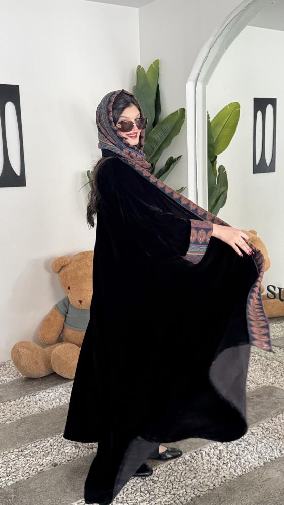 مخمل كلوش وكم كشميري وطرحه سوداء بطرف طويل(إمكانية تغيير لون المخمل أو الخامه)