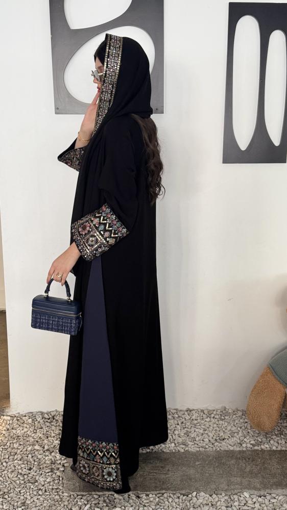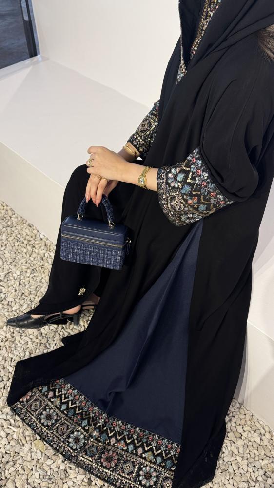 أكمام بتطريز هندي ومن الاسفل مع تدخيلات جانبيه باللون الكحلي