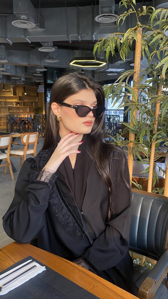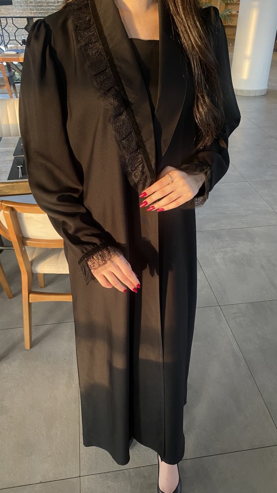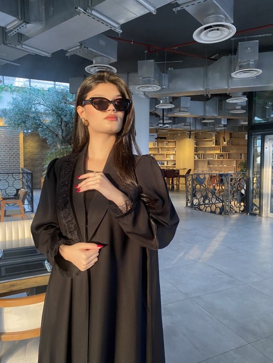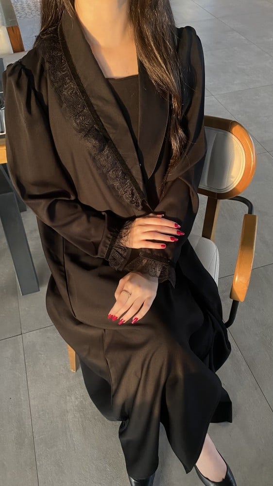 - نوع المنتج: كريب بسواد فاحم ودانتيل على الاكمام وطرف واحد من البليزر.