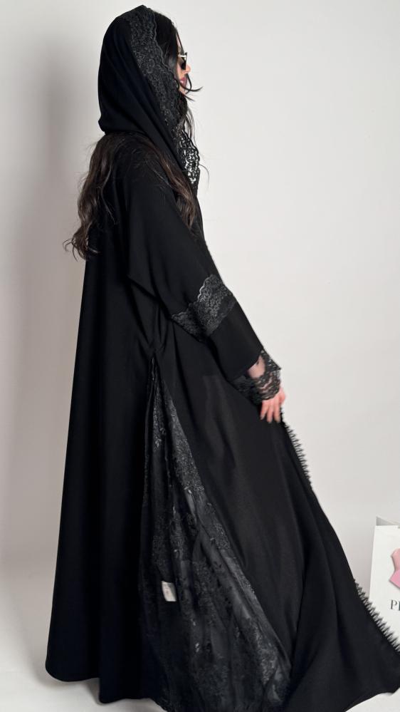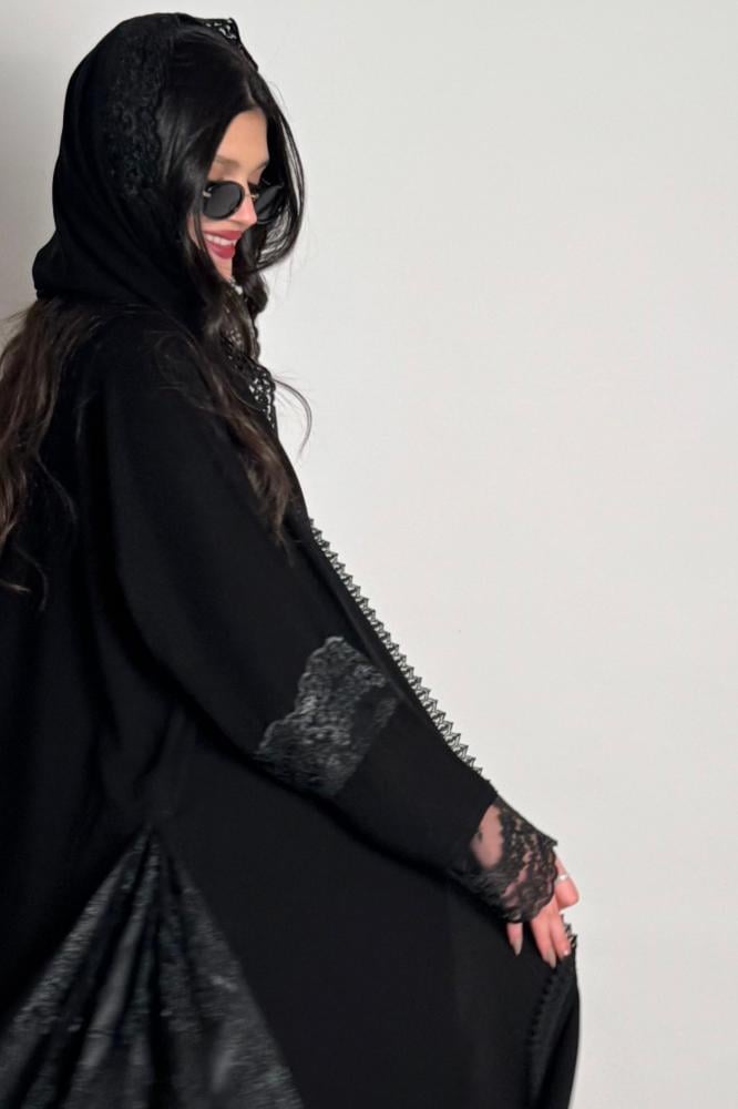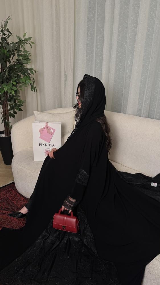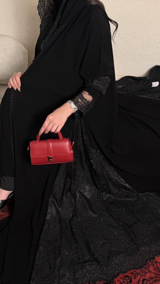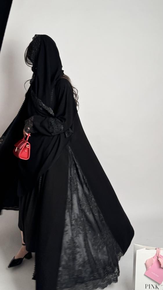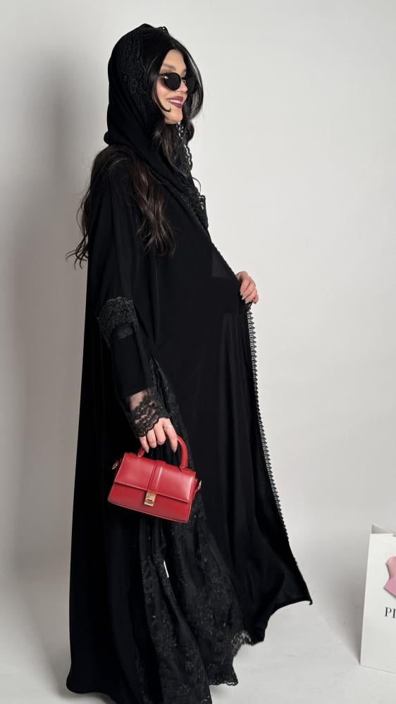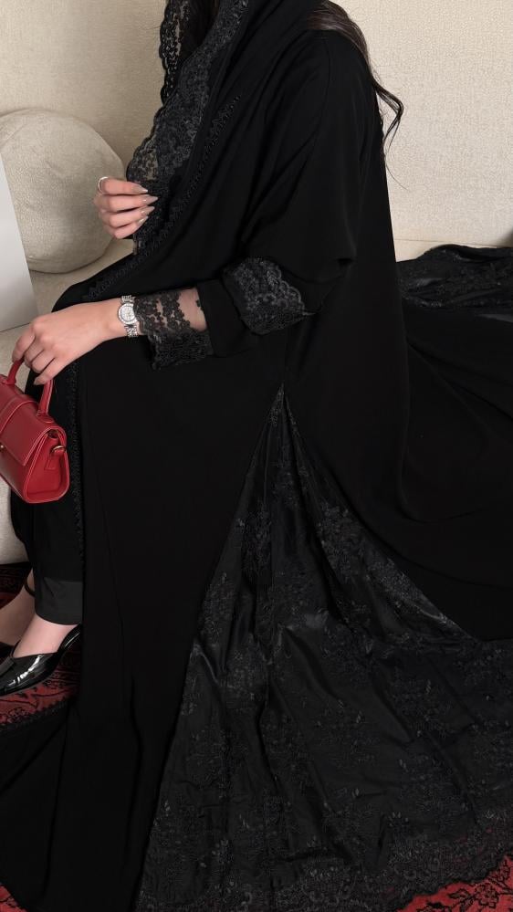 كريب ملكي كلوش بدانتيل أسود على الأكمام والجوانب المبطنة بالتفته الأسود وطرف الطرحه