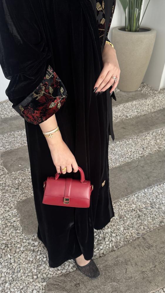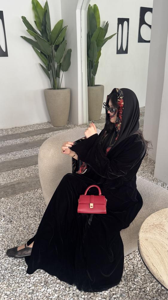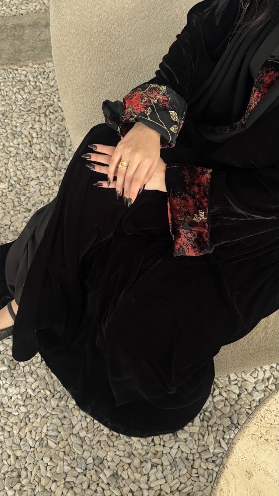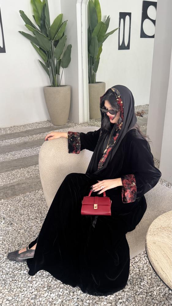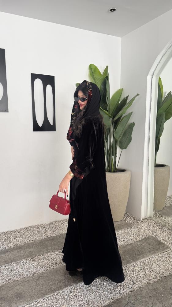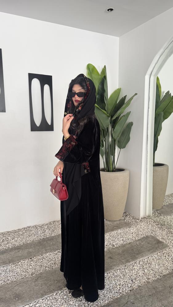 - الموديل: العباية نص كلوش، والأكمام مبطنه بالمخمل الشيفون طرف الطرحة الطويل من نفس قماش الأكمام.
